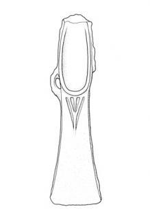 Il s’agit ici d’une hache dite « à talon et anneau latéral de type normand ». Le talon (sorte de butée) et l’anneau permettent d’arrimer la lame au manche plus solidement que les modèles antérieurs.