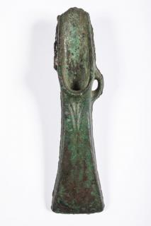 Réalisée en bronze, la lame est fabriquée dans un moule, généralement bivalve, en terre cuite ou en pierre, dans lequel est coulé le métal en fusion. Cet exemplaire, brut de fonte, est orné sur les deux faces d’une sorte de trident obtenu par des dépressions triangulaires, un décor peu courant.